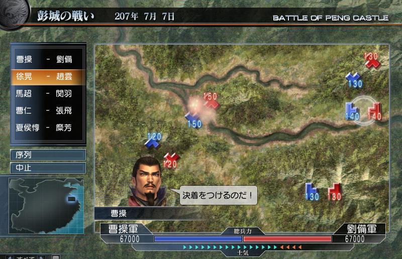 序盤ホントに最初、一瞬曹操軍の方が兵力勝ってた時があったんですけどね。
