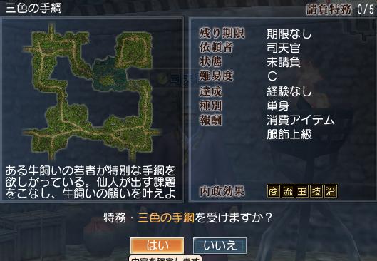 まず女キャラ用の特務は、5つの課題をクリアして出てきた道士を倒して糸を手に入れればクリアです。