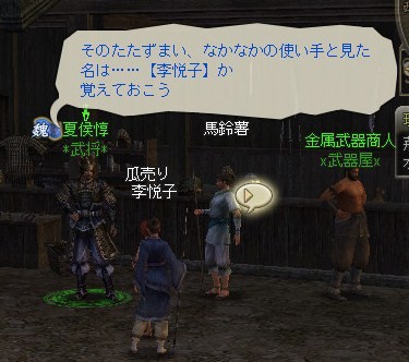 そうそう、村の中にいきなり隻眼の猛将が現れた時はビックリしました。しかも武器・防具を売っている商店に現れるなんて…「最初にココ来た時となんか違う…なんだこの違和感」って、最初気付かなかったです。で、よーく見たら『夏候惇 -武将-』という字が見えて…(笑)武将に会えると妙にテンションも上がりますねv