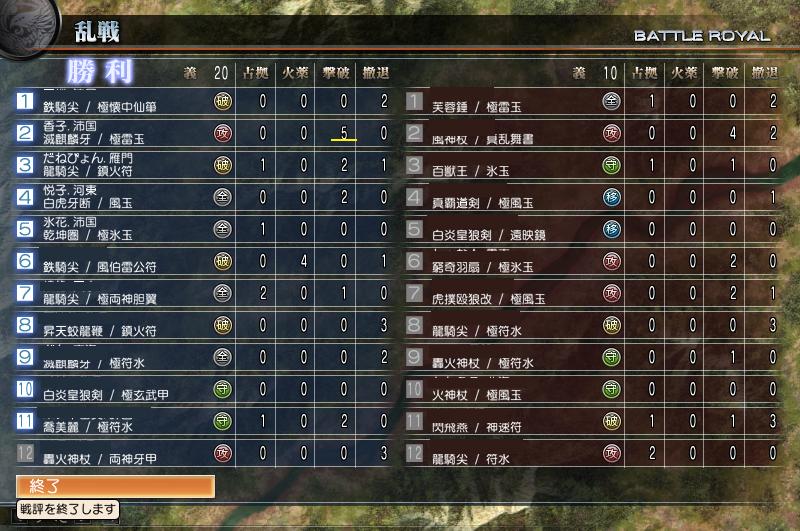 最後の方はほとんど兵糧に攻めに来る人が来なくてどうしようかとウロウロしちゃったけど、やっと来た人を一人倒したあと、近くの拠点の防衛に向かいました^^;