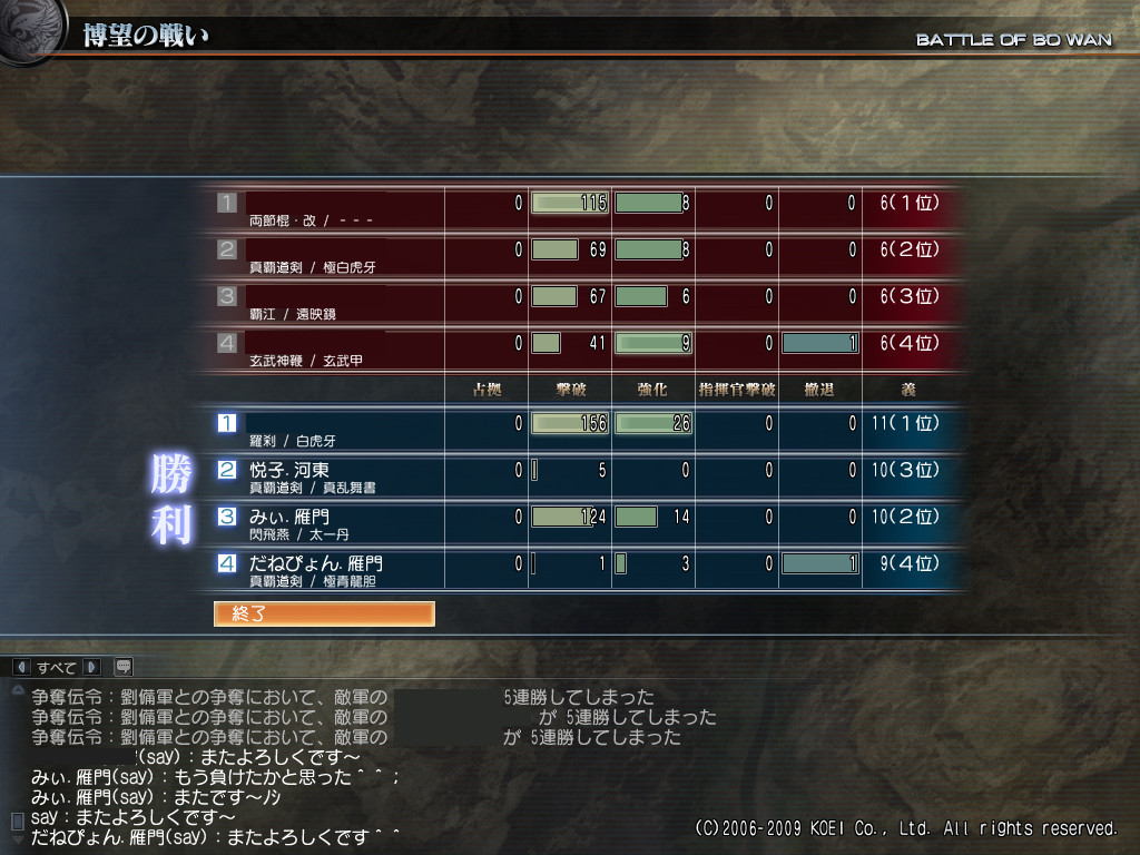野良2戦目の撃破戦は、相手に将軍以下の人がいたので大差で勝利。
