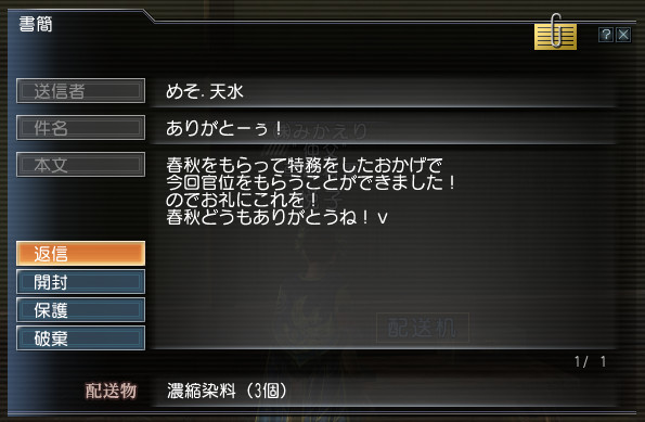 いつものようにサブで春秋を買い、それを悦子の配送しようと思ったら配送できないって出たんですよ。他のサブで悦子に何か送った覚えは無かったのでとりあえず確認しに悦子でINしてみたら…