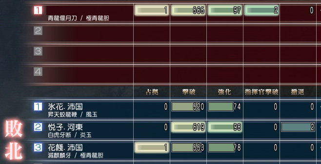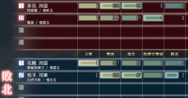 勝負内容は2000撃破で、敵には都尉が2人もいたんですが、1人R5エンゲツ+極光陰だったので途中まで結構ギリギリな戦いでした。