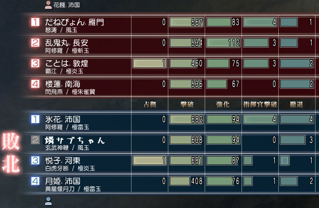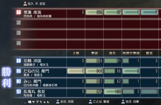 それぞれ①撃破役、②MAP内を走る役、③拠点を制圧する役 に分かれて課題をこなして行き、その後中央に集まると雪華とその守り5人が一気に出現するので、それらを倒せばクリアです。