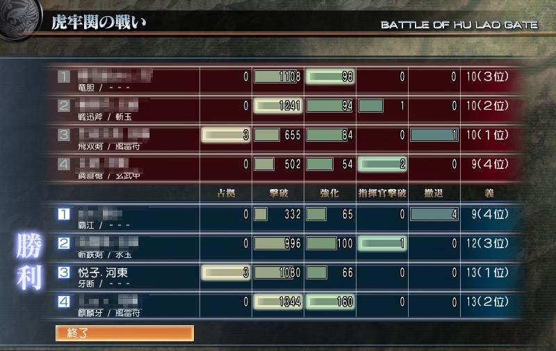 敵兵糧庫制圧して有利にして、総撃破数で勝ちました。
