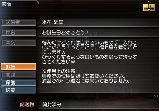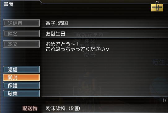 さて、祝日の月曜日(19日)、昼間にINすると香子さんからプレゼントが届いてましたヽ(´▽`)ノ