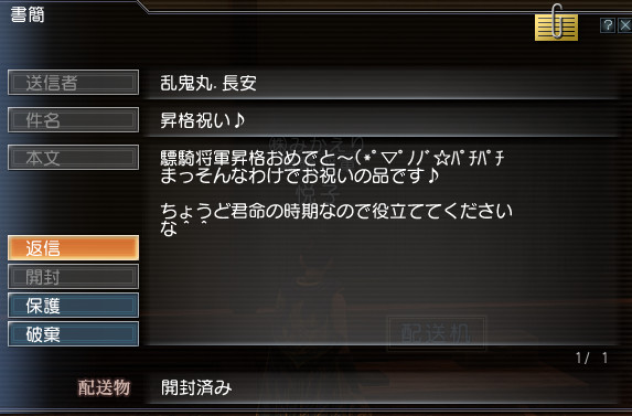 そうそう!このアイテム中に乱さんから驃騎将軍祝いのプレゼントを貰っちゃいましたvv
