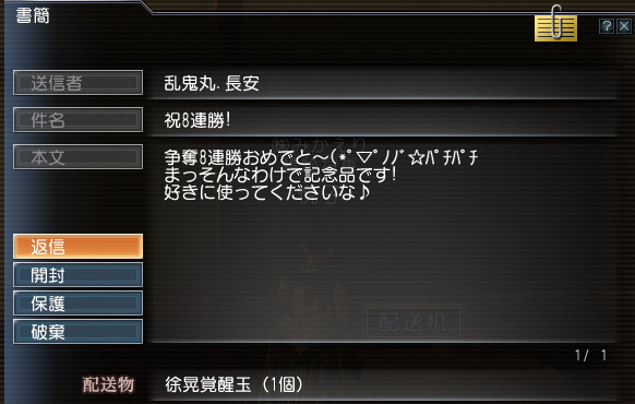 INすると、なんと!乱さんから8連勝のお祝いに『徐晃覚醒玉』が届いておりました!