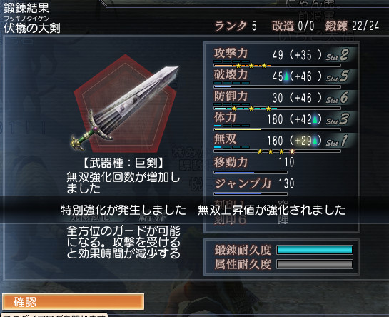 そうそう、アイテムで巨剣使ってたら体力が削れたので無双に鍛錬を付けてみたら…