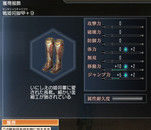 他にも、紅椿媛衣+9とか、紫翠麗玉甲+9も拾いました。