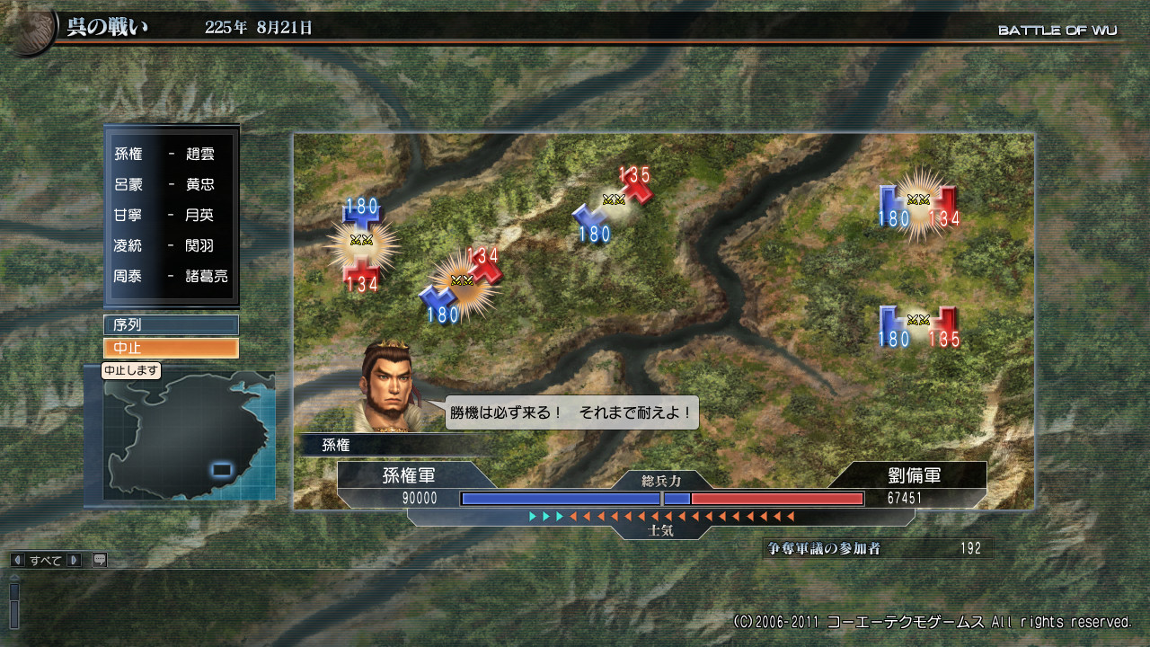 サブで覗いてみたけど、兵力は孫権軍がやや多めですが士気は劉備軍が多い。