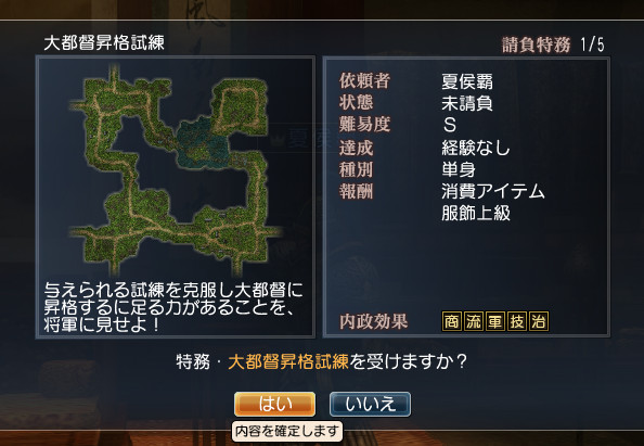 車騎将軍試験と同じMAPで4つの拠点制圧と1100人斬りと校尉3人倒す、でしたね。