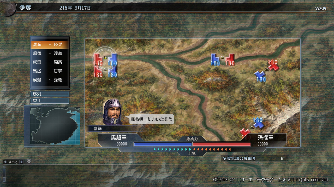 人数の少ない馬超軍には厳しい、兵力9万vs9万の戦い…((`・ω・´;)))